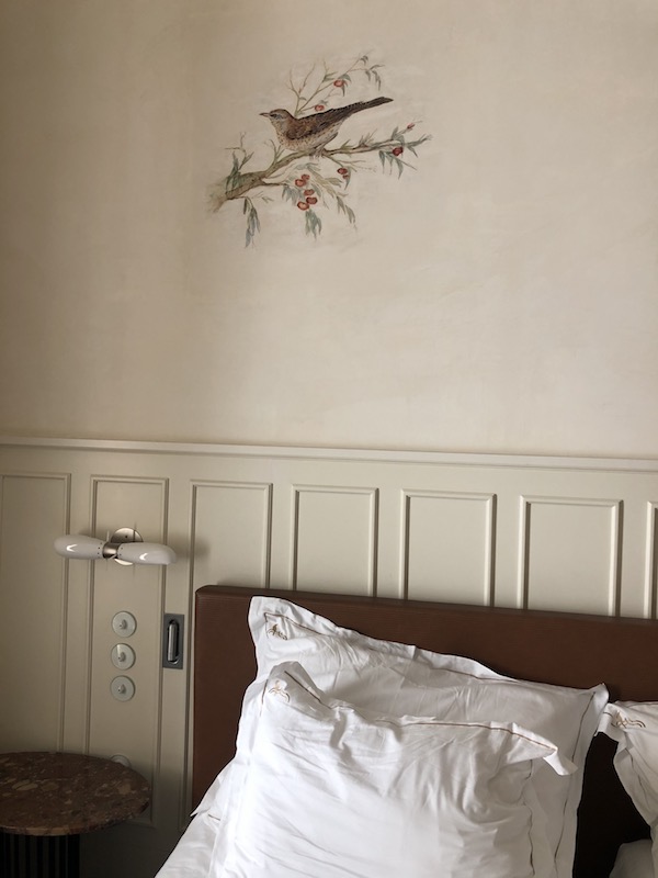 No quarto encontramos menu de travesseiros, incluindo até almofada de amamentação. Os amenities são da marca de luxo Le Labo. Eu achei genial a pintura de passarinhos bem discreta na parede.