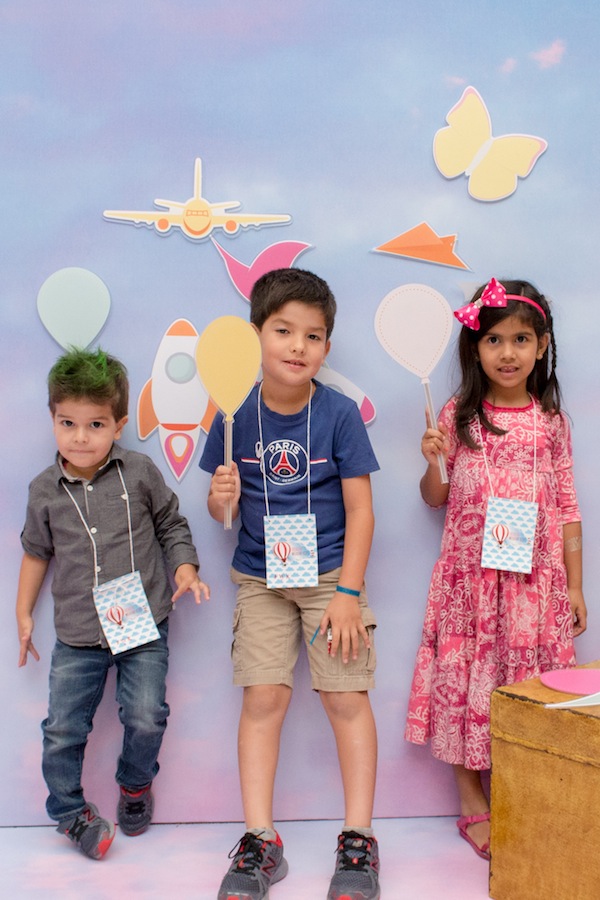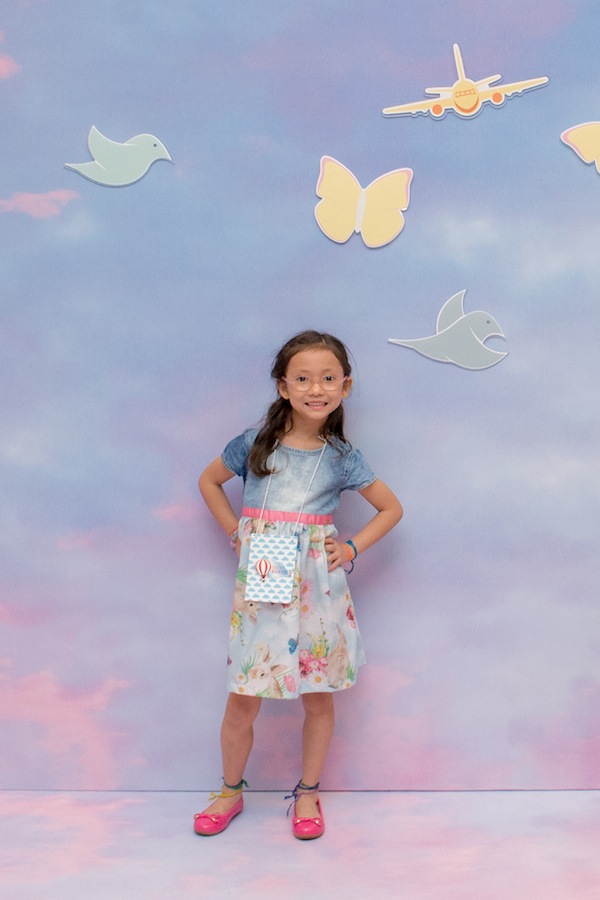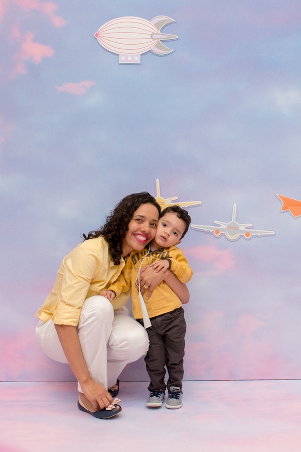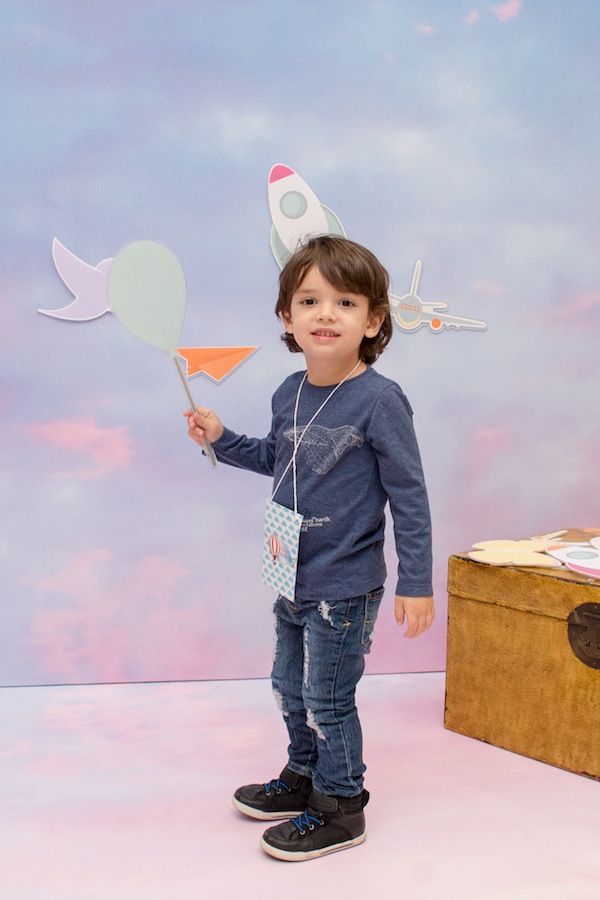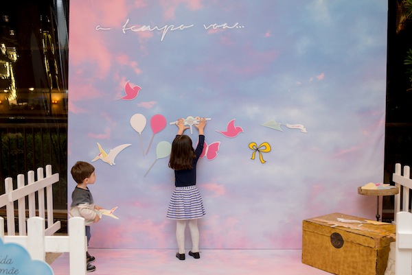 Quando fiquei sabendo que o tema do evento era “Nas Nuvens”, logo mandei uma mensagem para Paula Baracat e Renata Salvadego, as mesmas que fizeram a festa de 1 ano do Nicolas, lembram? Fizemos uma reunião deliciosa à base de bolo de banana com calda de doce de leite e começamos a criar o projeto. Eu queria que fosse interativo, que desse para pais e filhos participarem juntos, que remetesse ao tema nuvens e ao mesmo tempo ao blog também. No blog a gente fala muito sobre todas as fases da maternidade, em como cada fase passa rápido. E assim surgiu nosso tema “O tempo voa…“. Fazendo uma alusão ao céu, à tudo que voa, e ao fato das fases da maternagem passarem rápido, criamos um cenário com um céu lindo inspirado em Monet. O céu é pano de fundo para as crianças separarem suas peças favoritas que voam (tem avião, foguete, dirigível, balões, passarinho, borboleta, aviãozinho de papel…), grudarem no cenário criando algo único só delas para depois tirarem fotos e guardar de lembrança.