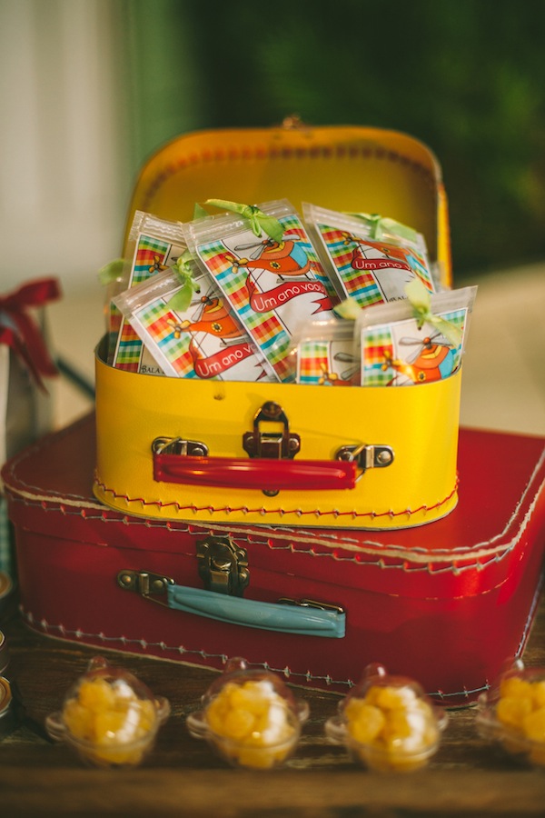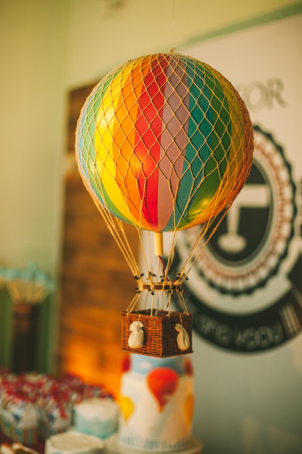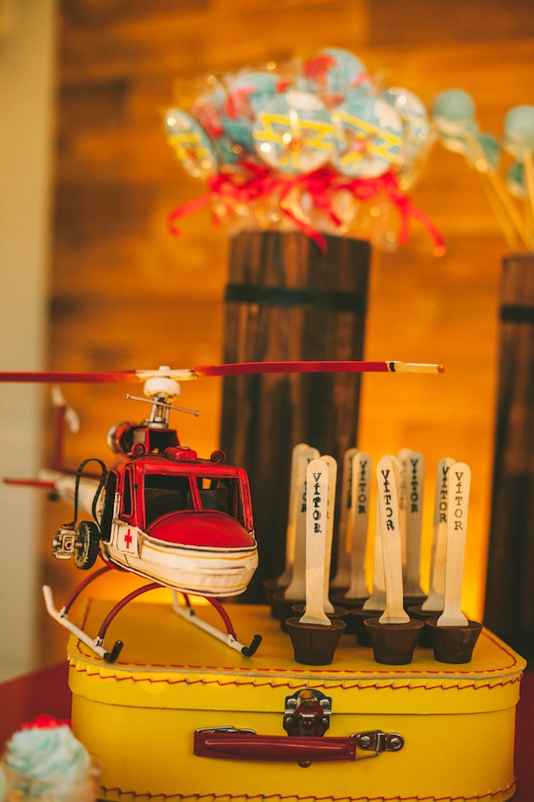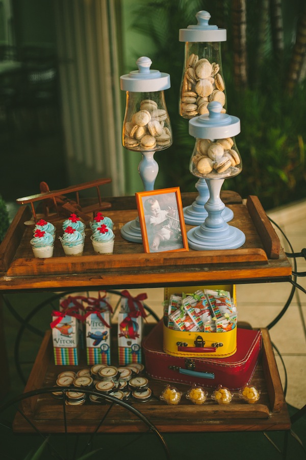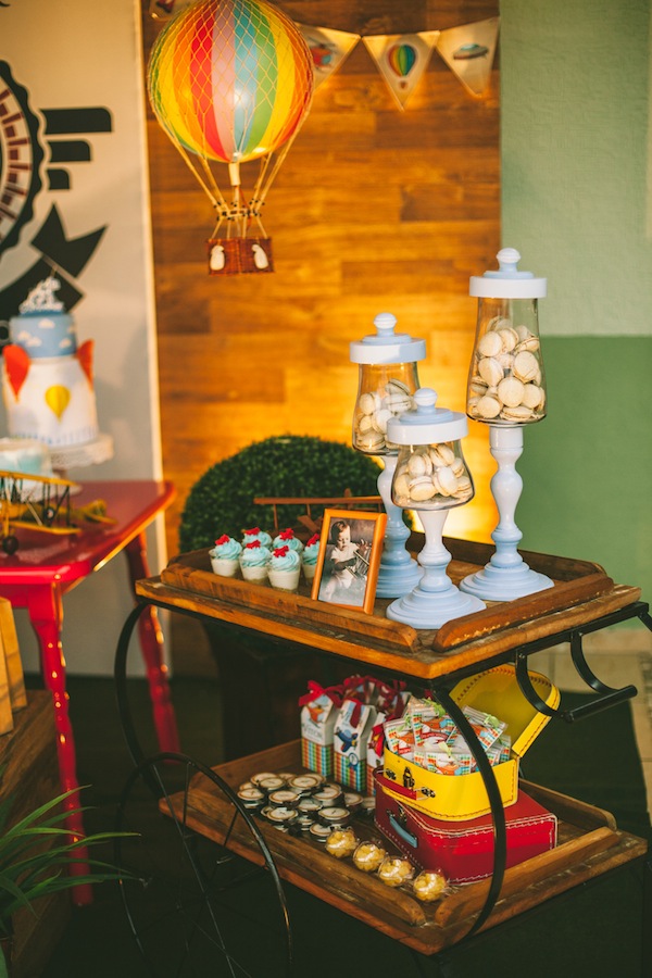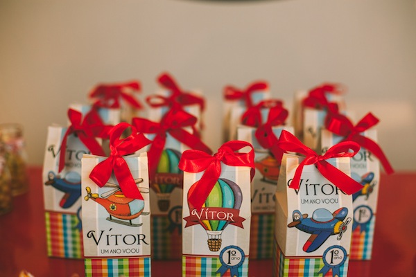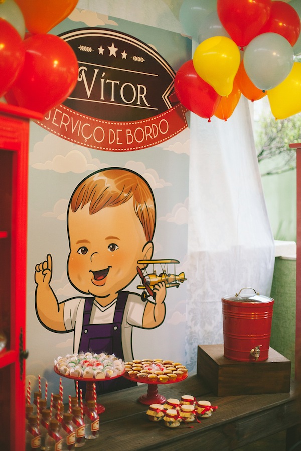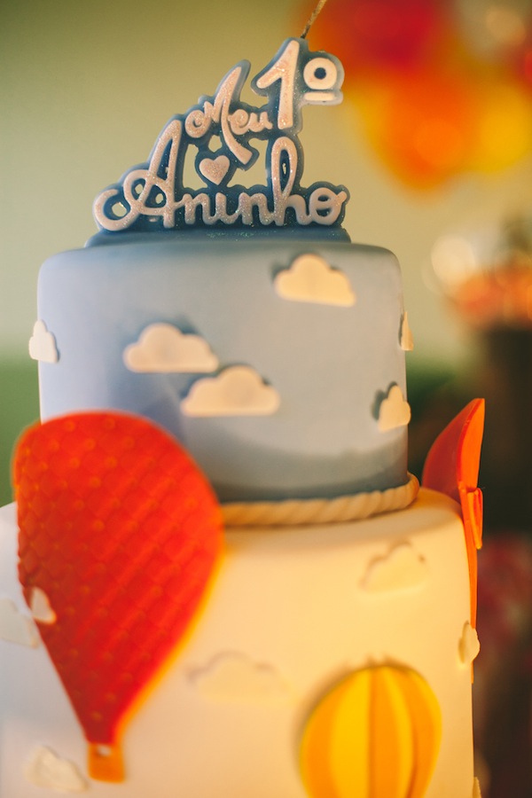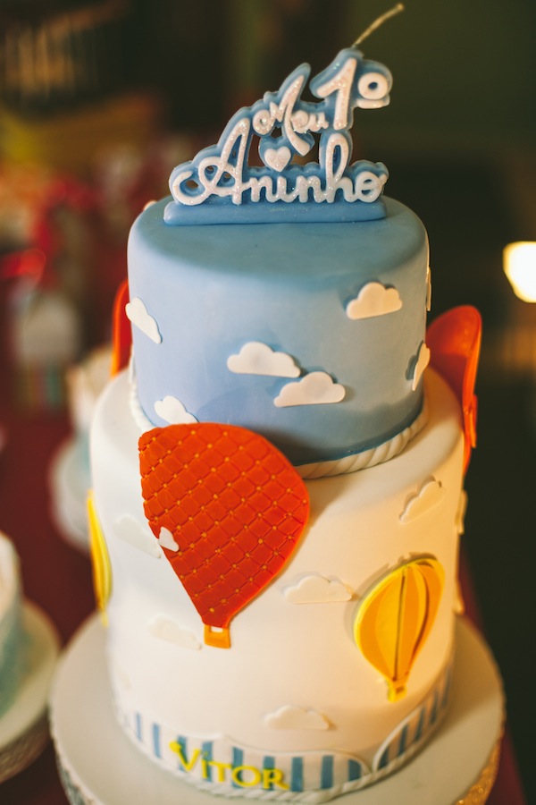 Escolher o tema da festa infantil nem sempre é fácil… Quando a festa é de 1 ano, o bebê ainda não pede nada, fica à cargo da mãe escolher o tema que mais gosta. A mãe do Vítor trabalha com confeitaria e sabe a infinidade de temas lindos para escolher, mas pensou em algo diferente. Ela comentava tanto que o primeiro ano do bebê “voou” (quem não usa essa expressão!! rs!), que foi assim que o tema foi definido: “O 1° ano voou!“. A decoração foi feita com diversas referências à tudo que voa: avião, balão, foguete, helicóptero, nuvens. Ficou muito fofo, com cara de festa de menino, e diferente!