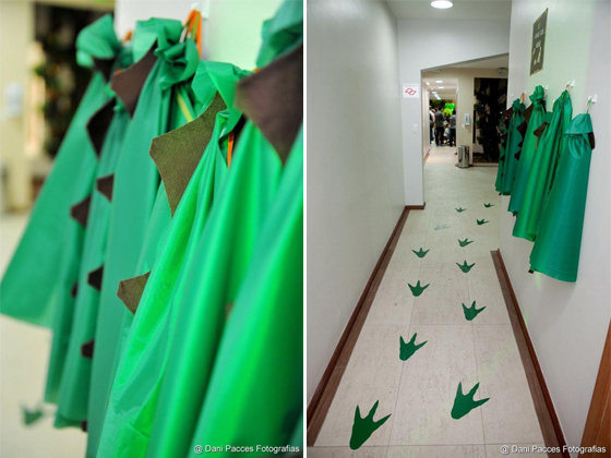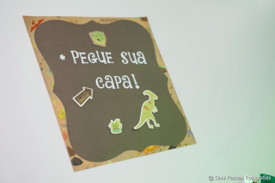 Com pouco mais de 1 mês de antecedência da festinha, eu comprei o que precisava e um dos quartos de casa se encheu de dinossauros. Lembro perfeitamente que o João passava as tardes brincando e, de vez em quando, corria para dar uma olhada no que eu estava fazendo para a festinha dele e, quem sabe, comer um chocolate ou uma balinha que sobravam por ali. Delicioso… Na semana da festa, decidi que iria fazer uma capinha para as crianças usarem na festa, imitando dinossauros. Como eu não sei costurar (ainda!) e queria algo que não desse muito trabalho, escolhi um “tecido” que permitisse o corte sem acabamento (usei o mesmo material que se usa em guarda chuvas). Escolhi o feltro para as corcundas e, com a ajuda de um molde que pedi pra minha vizinha (costureira) fazer, cortei nada menos que 50 capinhas. Confesso, deu muuuuito trabalho. Em compensação, ficou uma graça e as crianças curtirarm bastante (o que bastou para eu esquecer rapidinho o trabalho que deu!).