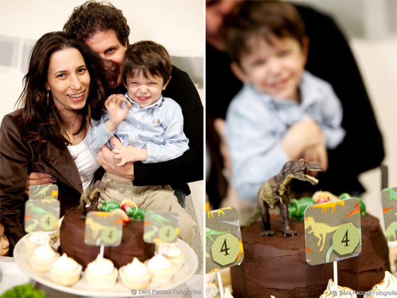 A festa estava marcada para as 18hs e eu teria a partir das 16hs (horário que terminava a festa anterior no buffet) para montar tudo. Deu certo!!! O João ficou em casa com o pai, que se encarregou de trocá-lo e distraí-lo até a hora da festinha. É indescritível a emoção que senti ao vê-lo entrar no buffet correndo, sorrindo e reconhecendo, ali, tudo o que havíamos feito juntos. O brinquedo preferido dele – um T-Rex – estava bem ali, em cima do bolo, como ele sempre quis.