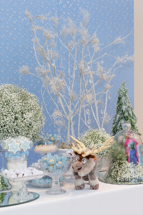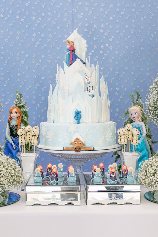 Já vi várias festas tema Frozen, mas essa ganha em elegância! Aliás, o tema, por si só já acho bem elegante: azul suave, flocos de neve, castelo de gelo, amor de irmãs. Mas a decoradora Juliana Bajon caprichou demais no bom gosto, criando esse fundo azul com flocos de neve para a mesa de doces. Entre outros detalhes, os cristais pendurados, os doces decorados, o bolo da Piece of Cake fazendo o castelo de gelo, ficou tudo encantador. Parabéns pelos 5 anos da Isabela!