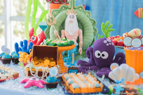 Compramos toda a decoração através do site ELO7, desde então todo mês chegava um pacotinho em casa com um “bichinho” diferente, curtimos muito toda a elaboração do tema e cada detalhe foi cuidado com muito carinho, toda mesa de doces foi feita por nós, toalha, back drop, bexigas, etc… Deu um super trabalho, mas o resultado valeu muito a pena! O resultado foi uma festa super animada, colorida e com a minha SEREIA linda na hora do parabéns!“.