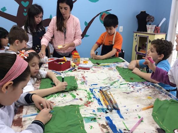 A primeira coisa que a gente preza é dar conteúdo para a criança. As crianças são diferentes, se dou uma tinta e falo: crie, podem ter crianças que tem o dom e vão pintar, mas eu acredito que é preciso mostrar pra criança toda a variedade que existe. Eu acredito que a criança tem que ser orientada, que é preciso dar conhecimento – de material, de processos, de como fazer – pra dai, então, ela criar.