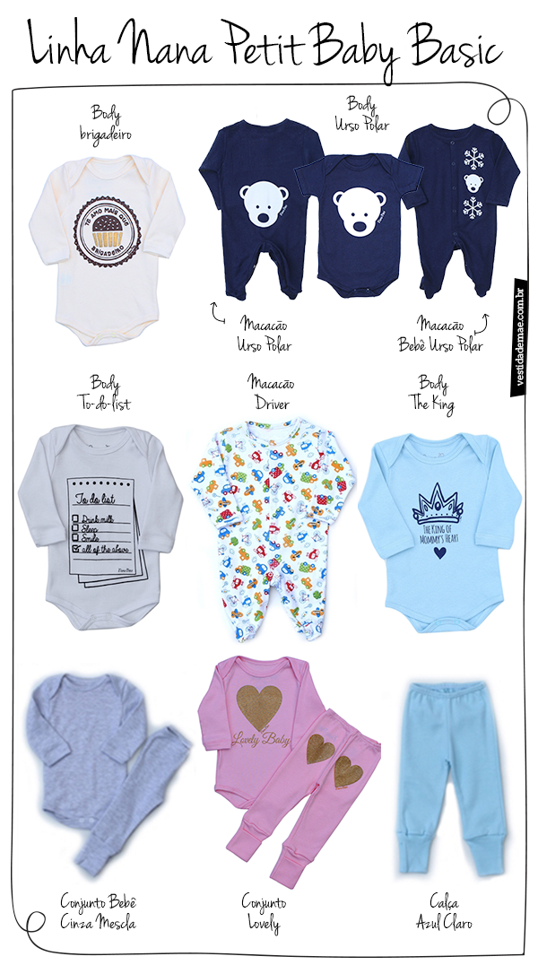 Hoje a linha possui macacões, calças e bodies 100% algodão em malha suedine, todas muito macias e favorecendo o conforto. Os bodies possuem gola americana para serem vestidos facilmente, já as calças foram confeccionadas com punho reversível para proteger os pezinhos do bebê e também para serem usadas por mais tempo”.