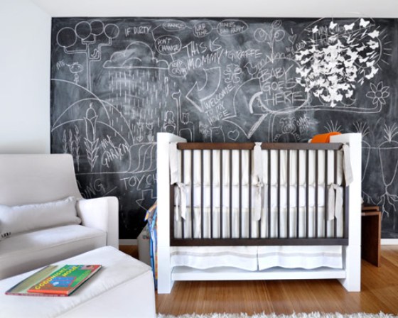 Já que os bebês vão crescer e entrar na fase de rabiscar a parede, que tal uma parede inteirinha de lousa para deixar a criatividade solta? É decorativa, você pode “mudar” a decoração todos os dias rabiscando novos desenhos e sem medo de ser feliz riscando a parede. Quartos de bebê cada vez mais bacaninhas.