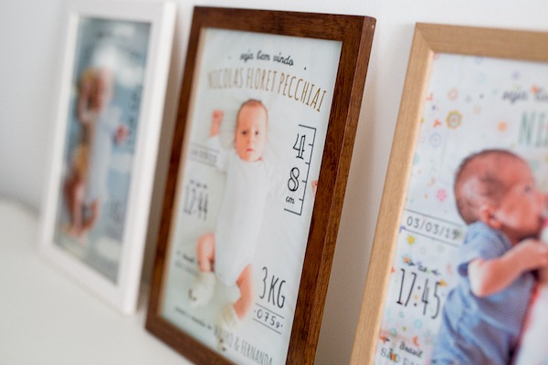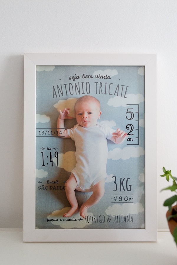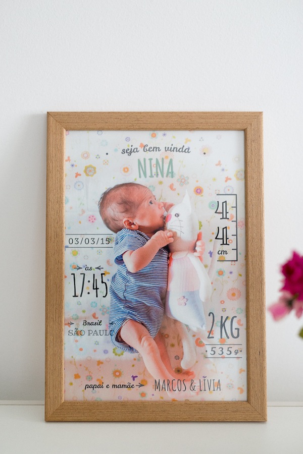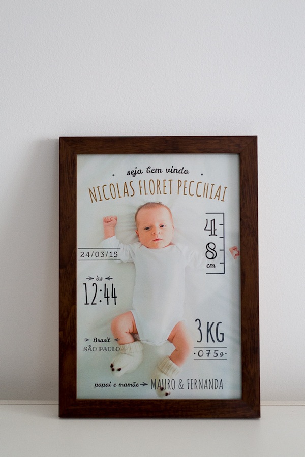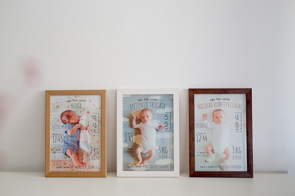 A fotógrafa Carla D’Aqui criou esse quadro lindo chamado Boas-Vindas. A ideia é fotografar o bebê recém-nascido e com uma das fotos fazer esse quadro para você pendurar no quarto do bebê. Eu amei a proposta de design super clean, é o estilo moderinho e fofo ao mesmo tempo que eu adoro. É legal também guardar um registro com os dados do bebê, como peso, altura, horário de nascimento, afinal com o tempo a gente esquece. Imagino ser uma dessas peças para serem guardadas para sempre como lembrança.