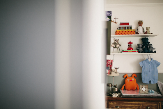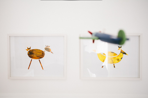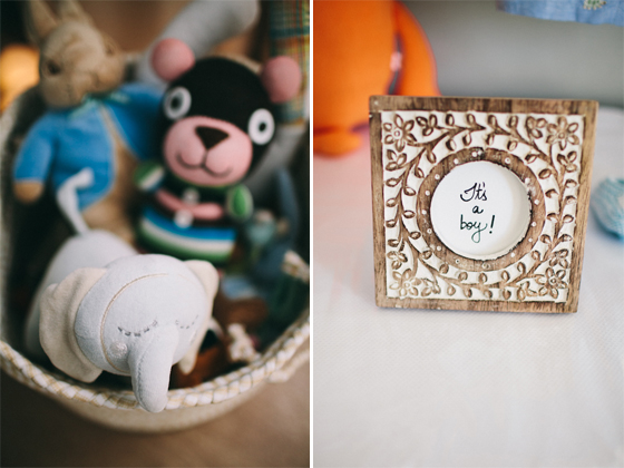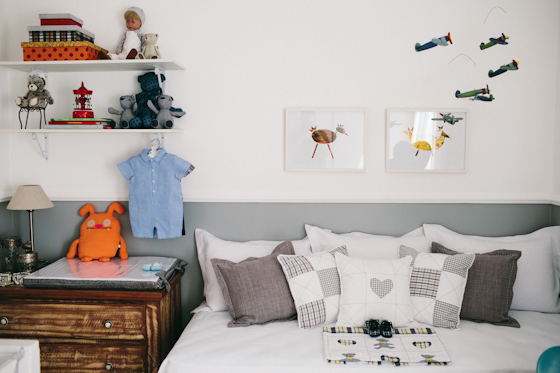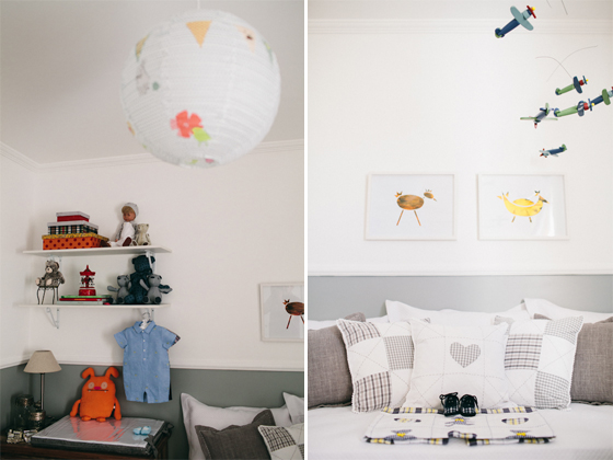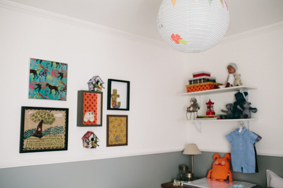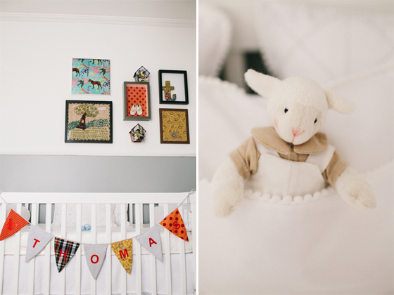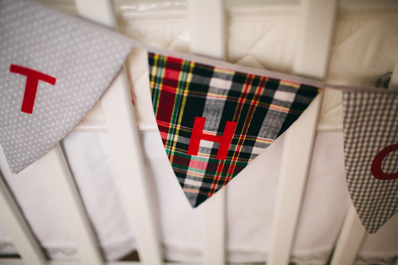 Os quartinhos de bebê não precisam ser todos iguais! O quarto do Thomás tem bandeirinhas feitas pela avó materna, a maioria dos quadros atrás do berço também e os quadros em cima do sofá foram pintados pela mãe. Ficou um chamr só!