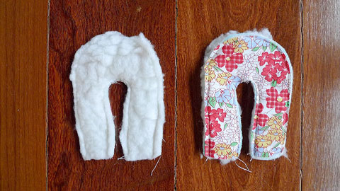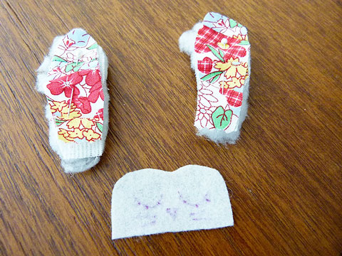 1. Corte o molde como indicado: duas partes da pelúcia branca, duas do forro, duas da manta, duas do tecido para a parte interna da sola, duas do feltro para a parte debaixo da sola. As alças viraram orelhas, então se você quiser fazer um coelho como o meu, corte 4 alças e quatro forros do mesmo tamanho.