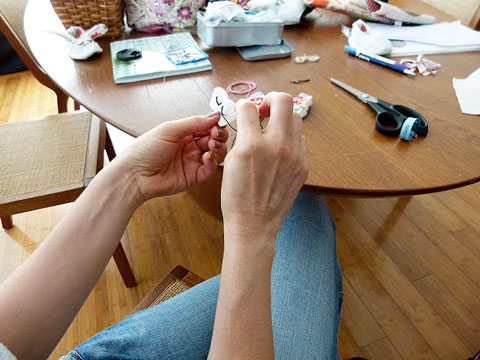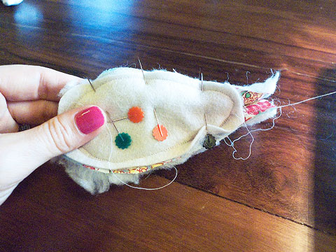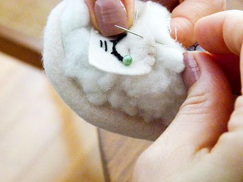 8. Alfinetei o rosto no lugar e prendi com ponto caseado.