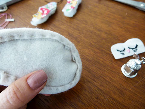 5. Para dar acabamento, fiz um viés com uma tira de feltro e costurei na volta toda do sapato, primeiro a parte de cima à máquina, depois arrematei embaixo à mão mesmo. Não é o modo mais prático, mas funciona, principalmente se você estiver trabalhando com feltro, o que torna tudo mais simples.